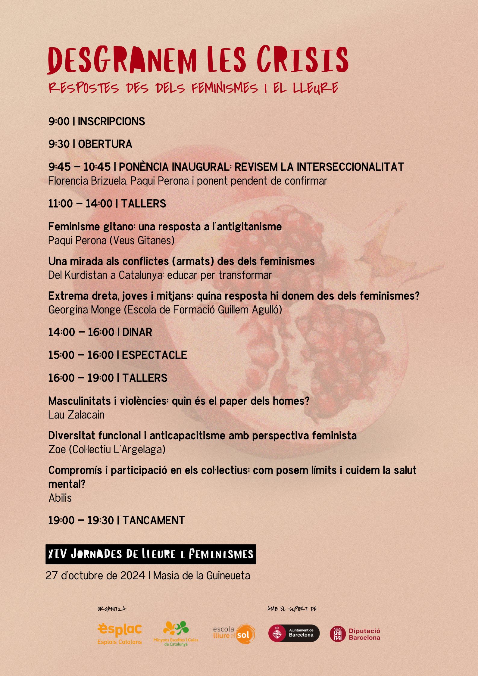 El diumenge 27 d’octubre és el torn de les esperades Jornades de Lleure i Feminismes, que aquest any celebren la seva catorzena edició a la Masia de la Guineueta (Barcelona). Sota el títol Desgranem les crisis: respostes des dels feminismes i el lleure, l’objectiu de la trobada és abordar els múltiples reptes als quals ens enfrontem en l’actual context de crisi global. Amb aquesta proposta, l’Escola Lliure el Sol, Esplais Catalans i Minyons Escoltes i Guies aposten per la revisió de l’anàlisi i la pràctica de la interseccionalitat des d’una mirada crítica. Al web d’Esplac també trobareu tota la informació necessària i l’enllaç a les inscripcions, que es fan a través del web de l’Escola Lliure el Sol.