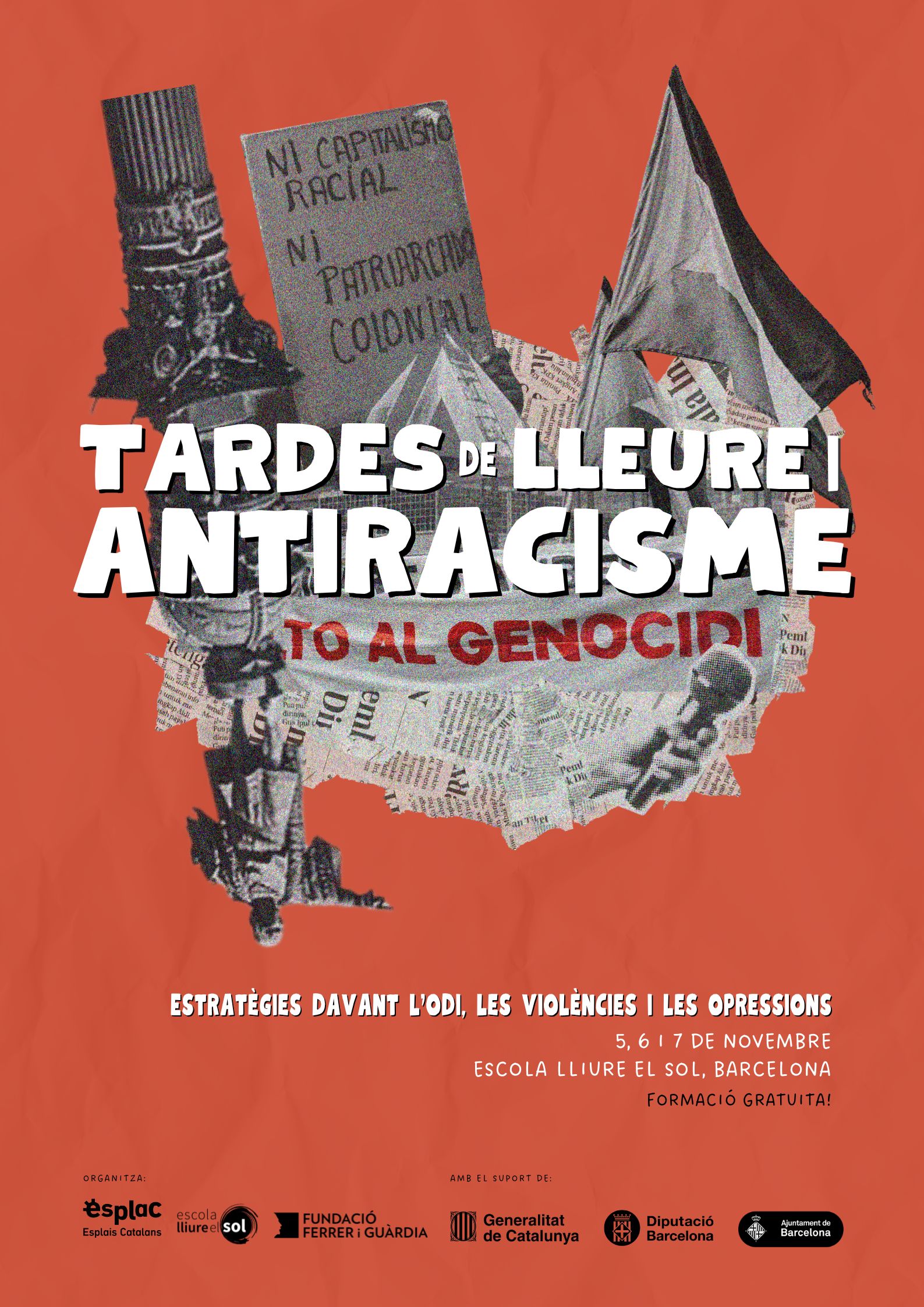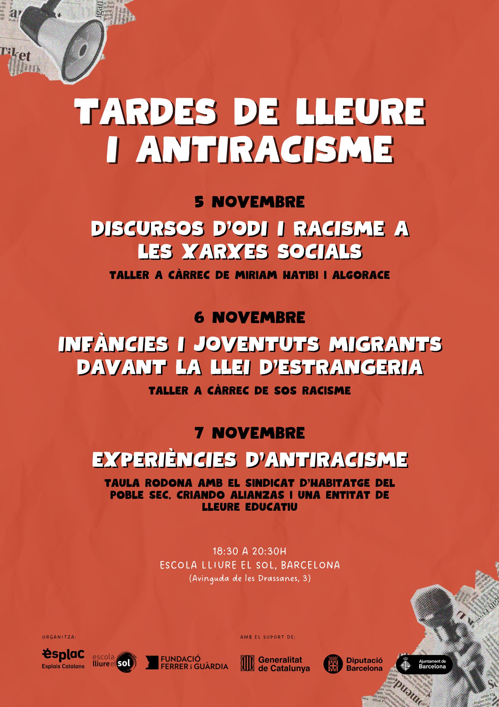 Per acabar, els dies 5, 6 i 7 de novembre tindrà lloc la segona edició de les Tardes de Lleure i Antiracisme, un espai formatiu organitzat per Esplac, l’Escola Lliure el Sol i la Fundació Ferrer i Guàrdia. En aquestes jornades es parlarà sobre el paper de les xarxes socials en l’extensió dels discursos d’odi, s’analitzaran els impactes que genera la Llei d’Estrangeria a infants i joves i s’exposaran diferents experiències antiracistes amb l’objectiu de pensar i definir de quines estratègies disposem per confrontar l’odi, les violències i les opressions. Al web d’Esplac teniu tot el que necessiteu saber i podeu apuntar-vos als tallers a través del web de l’Escola Lliure el Sol!