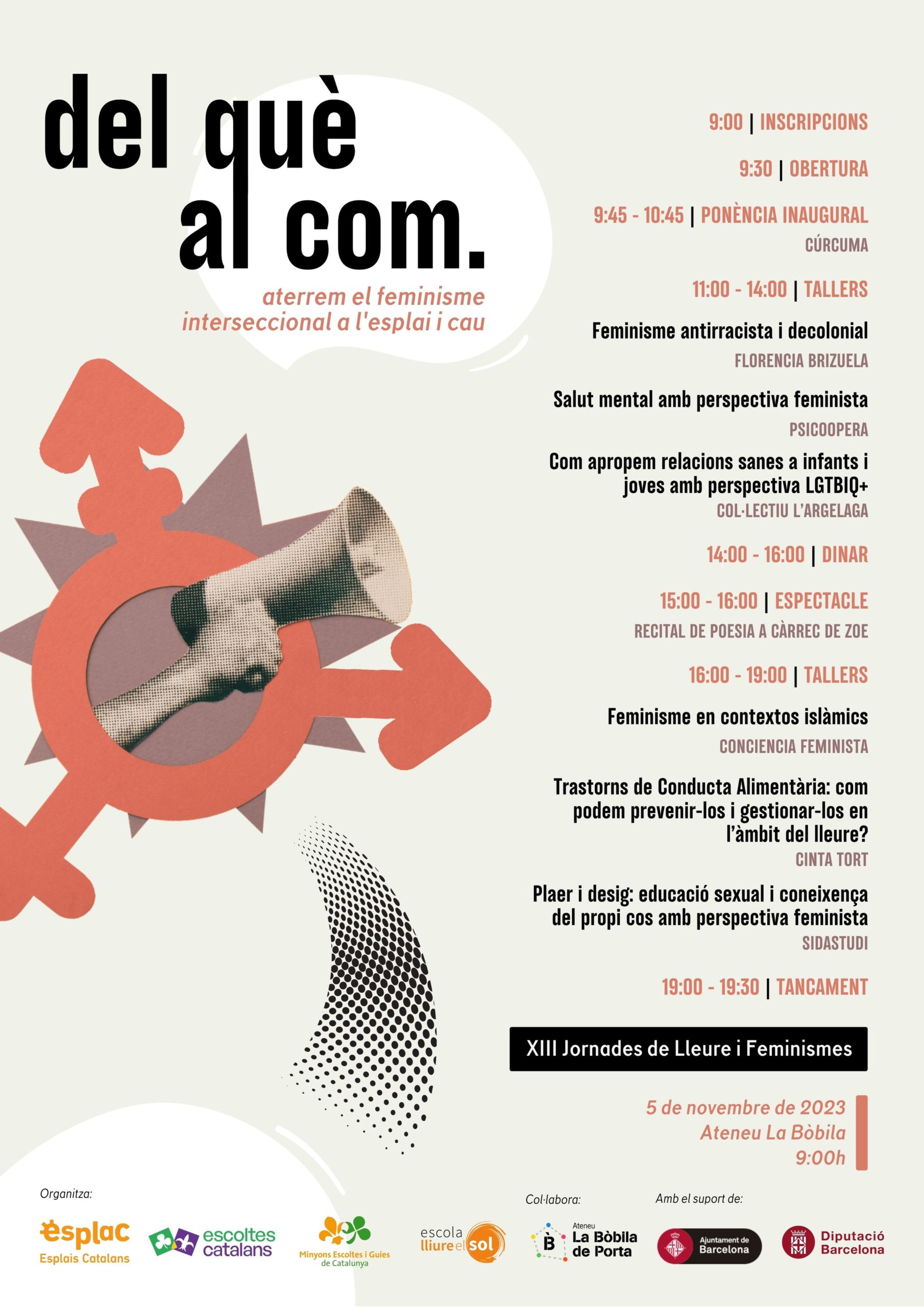 El diumenge 5 de novembre és el torn de les esperades JORNADES DE LLEURE I FEMINISMES, que aquest any celebren la seva tretzena edició. La voluntat d’aquest espai és anar més enllà de la teoria i dels discursos per formar-nos i reflexionar sobre com portem a la pràctica el feminisme interseccional. Altre cop, al web trobareu tots els detalls! Us podeu inscriure a través de l’Escola Lliure el Sol.