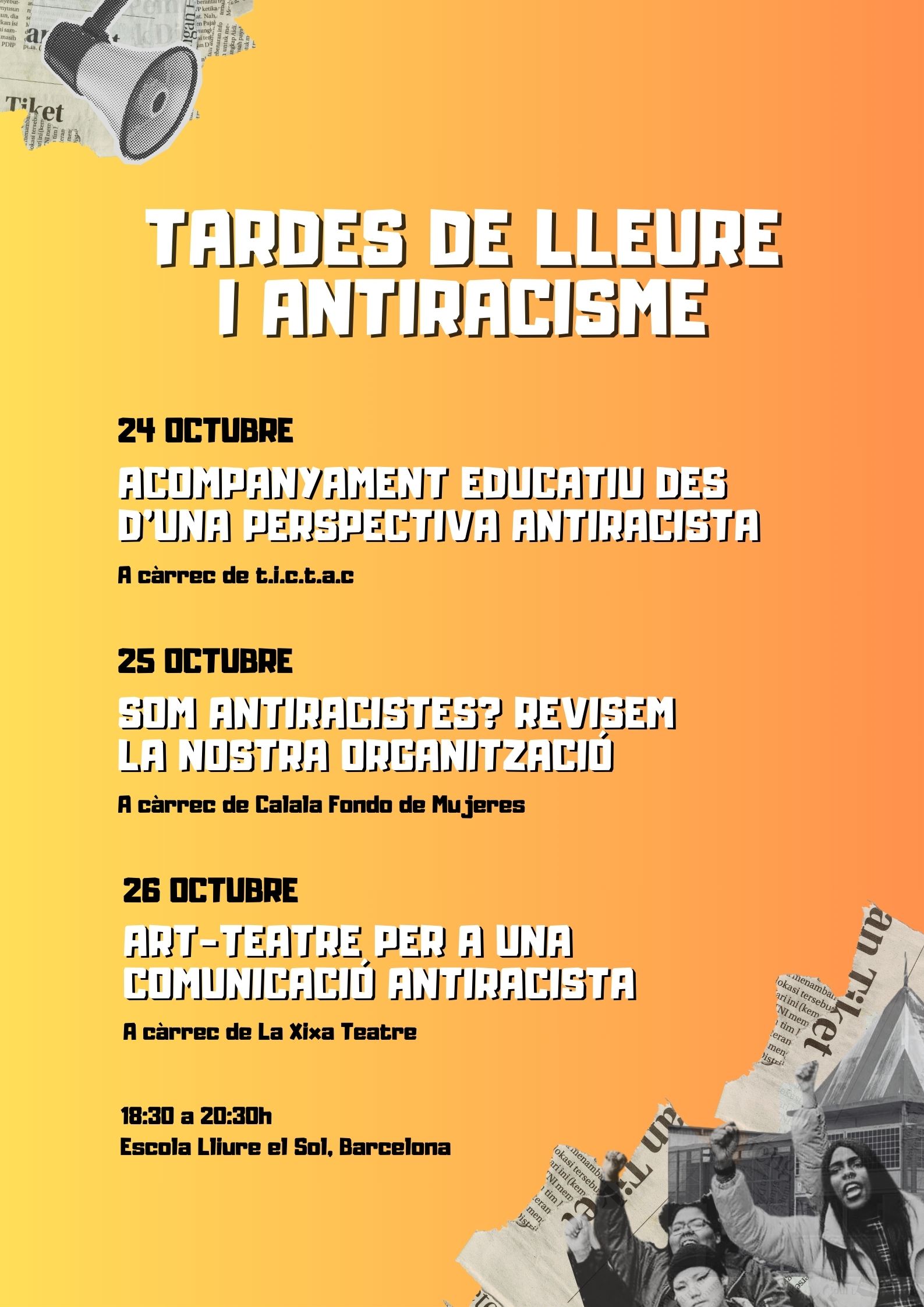 Els dies 24, 25 i 26 d’octubre arriba la primera edició de les TARDES DE LLEURE I ANTIRACISME . Aquesta proposta pretén generar diferents espais de reflexió sobre com educar des d’una perspectiva antiracista i decolonial. Al web d’Esplac també trobareu tota la informació necessària! Podeu apuntar-vos als tallers a través del web de l’Escola Lliure el Sol.